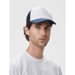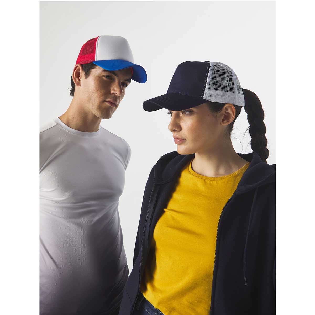 100% poliestere. Cappellino a 5 pannelli con pannello frontale e visiera in poliestere imbottito, pannelli laterali e posteriori in mesh, chiusura con cinturino in pvc, visiera precurvata, taglia unica.